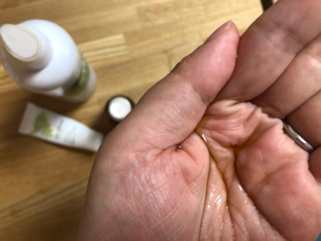 使用感としては写真のようにサラサラとした液体なので、手にローションを移してからこぼさずに患部に塗るのが難しく感じました。が、モッタリとしたテクスチャにするために余計なものが入っているよりはいいや。と個人的には納得しています。